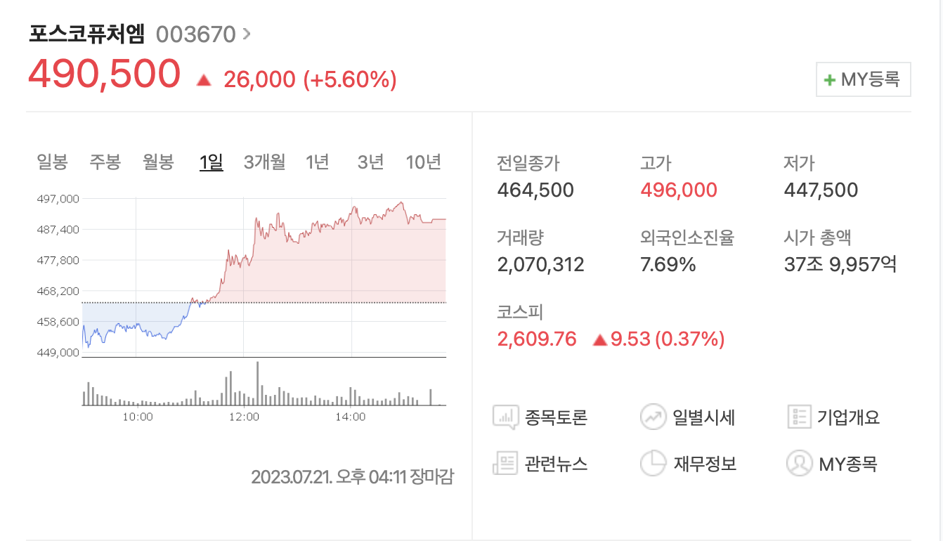 - 포스코퓨처엠 현재 주가는 7월21일 종가기준으로 490,5000원을 마감하였다.