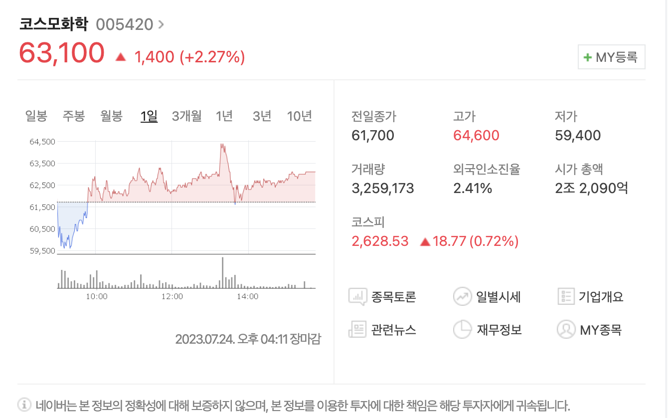코스모화학 주가는 7월 24일 기준으로 +2.27% 오른 63,100원이다.