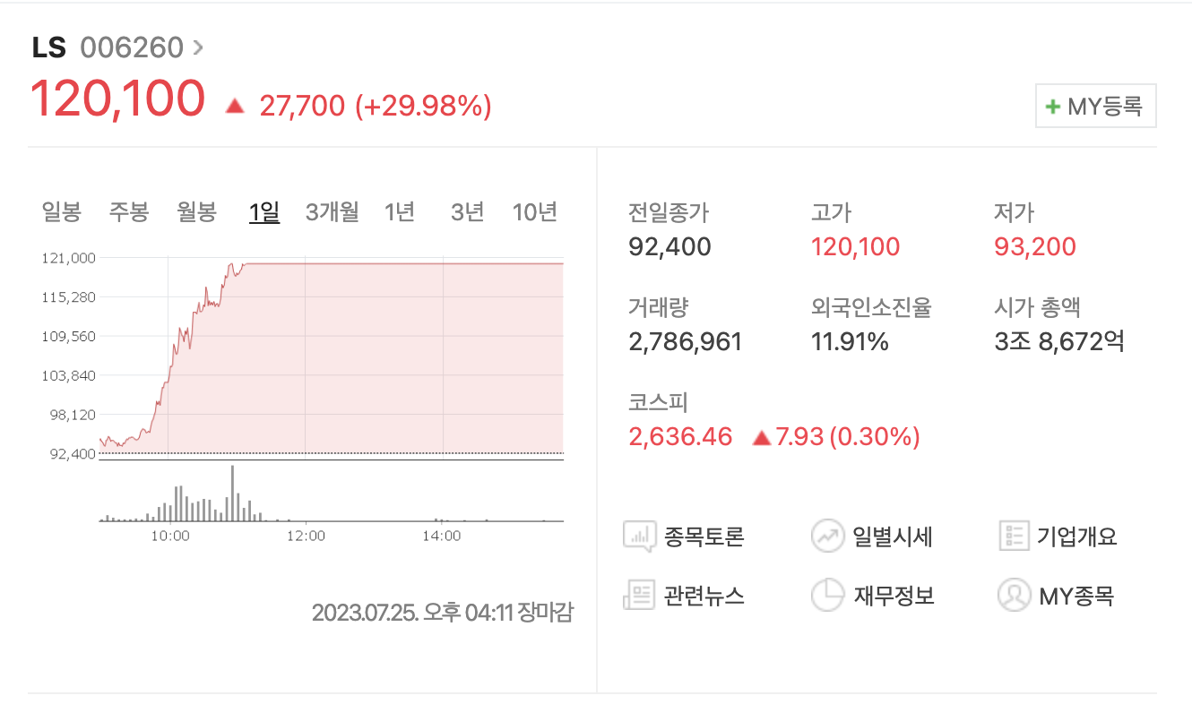LS 현재 주가는 올해 +29.98% 오른 120,100원 종가를 기록하였다.