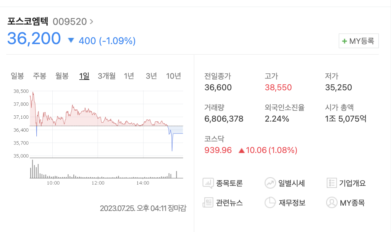 포스코엠텍은 오늘 종가기준으로 36,200원에 마감을 하였습니다.