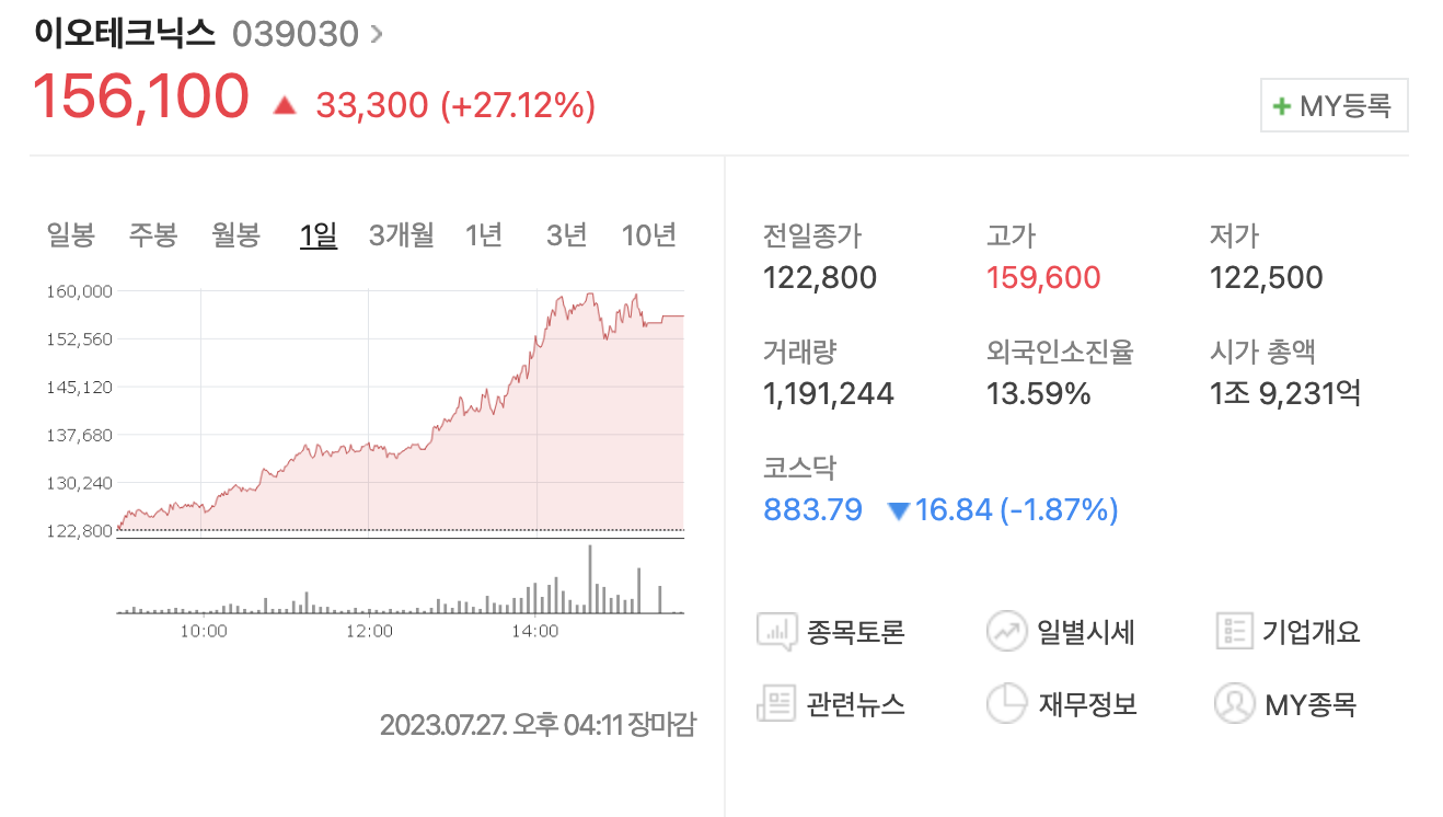 오를 것으로 보이며, 52주 신고가를 이룬 이오테크닉스 상장이후 최고가를 기록하였으며 내일도 2차전지 매도세가 심하게 될 경우