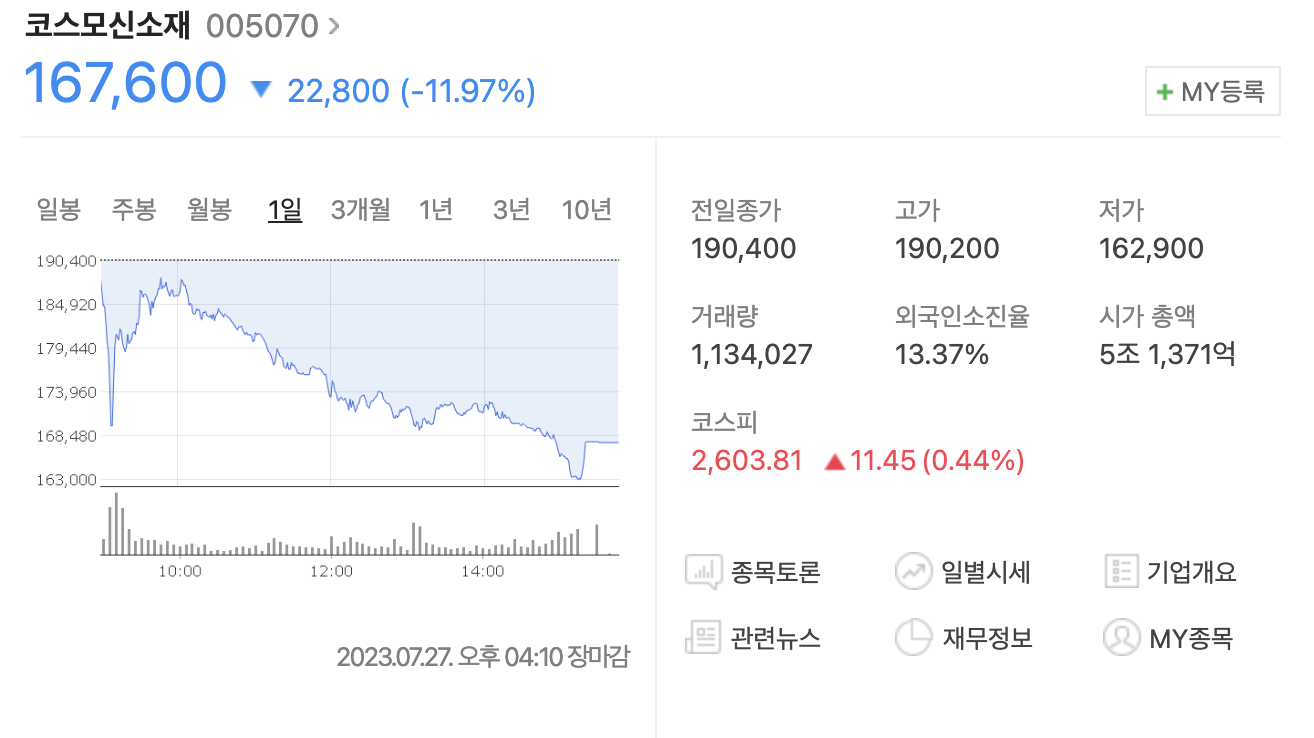 코스모신소재 기업정보 주가하락이유 주가전망 알아보기