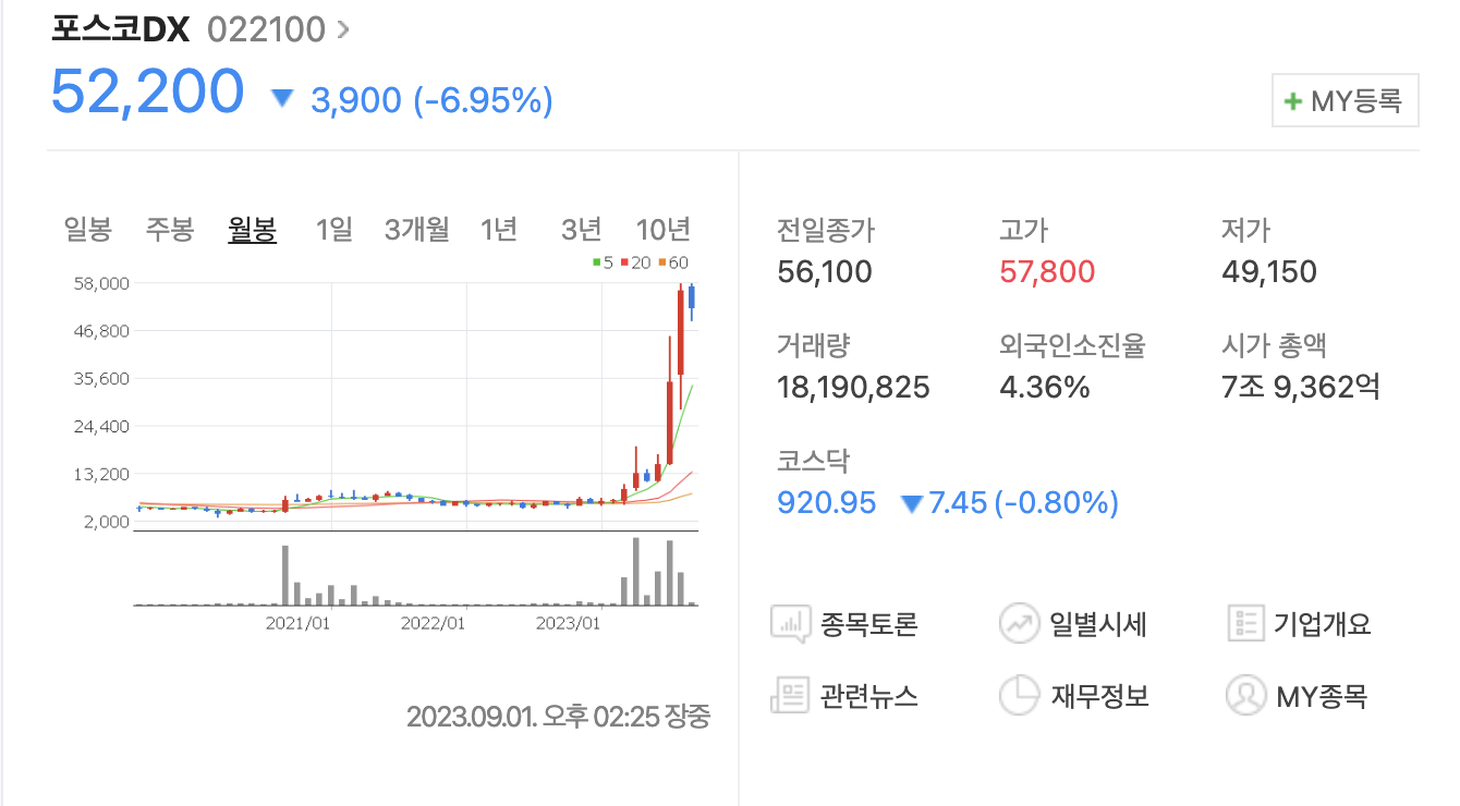 - 월봉과 일봉 기준으로 일봉으로는 금일 기준으로는 하락세이며, 월봉상으로는 1만 원대에 머물던 포스코 DX가 4개월 만에 주가가 대략 5배 급등을 한 것을 볼 수 있다.