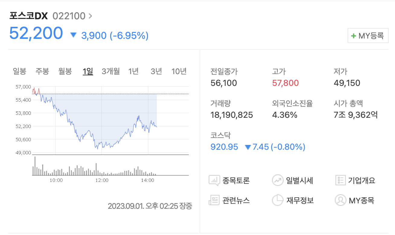 - 포스코 DX는 코스닥 시장에 상장이 되어 거래가 되고있지만, 코스닥에서 코스피로 이전하는 단계를 거치는 중이다.