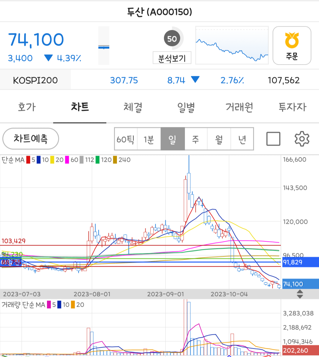 13만원이였던 두산은 현재 74,100원까지 내렸습니다.
