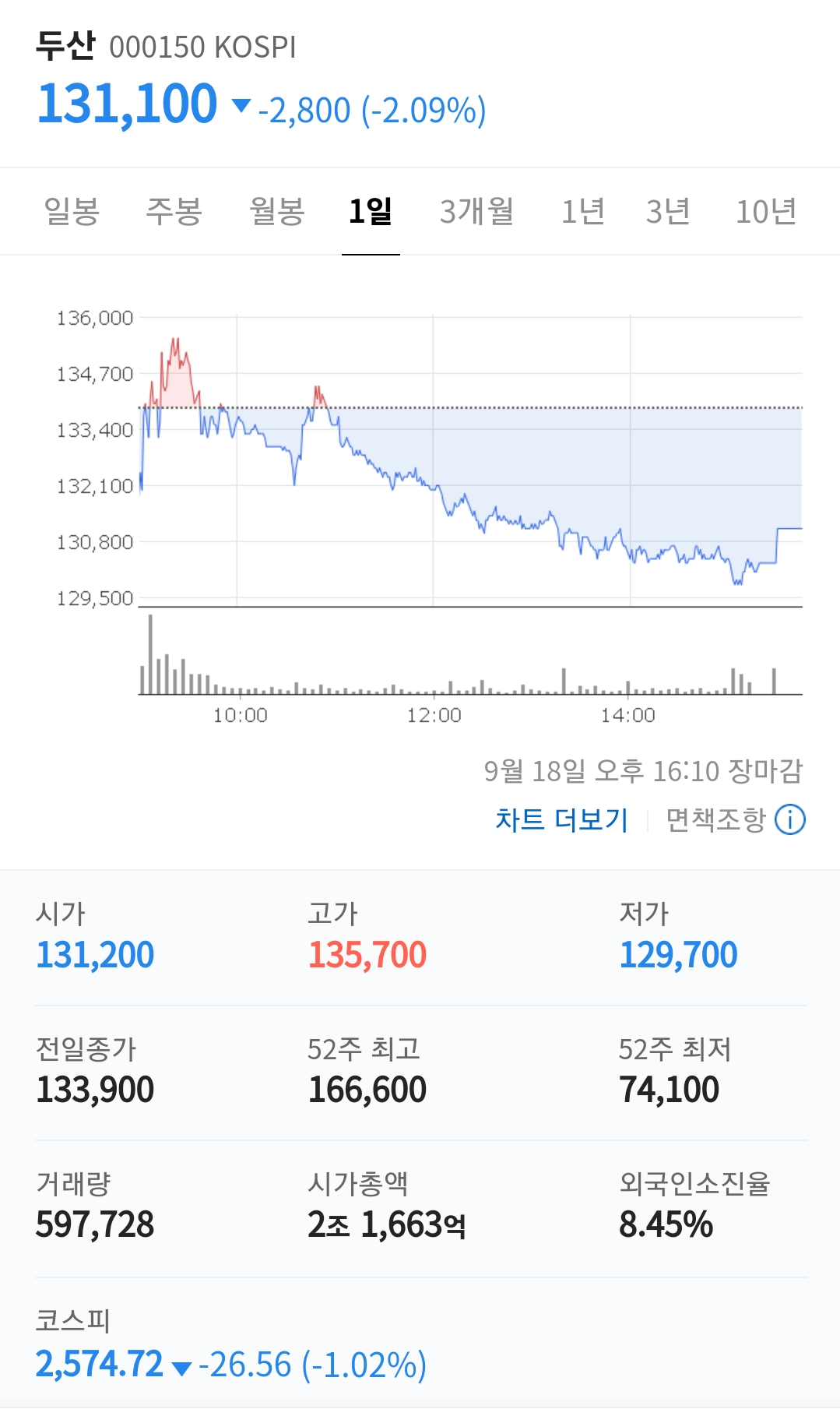 두산의 현재가는 131,100원이며 9월11일에는 상한가도 기록하기도 하였다.