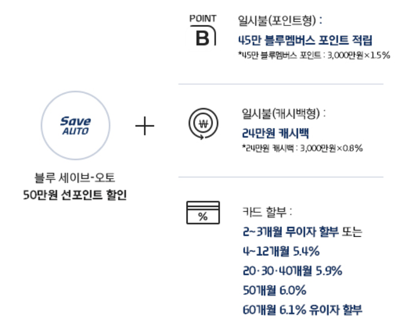 차종별 금액이 20만 원 / 30만 원 / 50만 원 선포인트로 할인을 먼저 받고 최장 36개월간 카드 이용 금액에 대해 블루 세이브 - 오토 포인트를 적립을 받아 상환하는 차량 구매할 수 있는 현대 자동차만의 프로그램입니다.