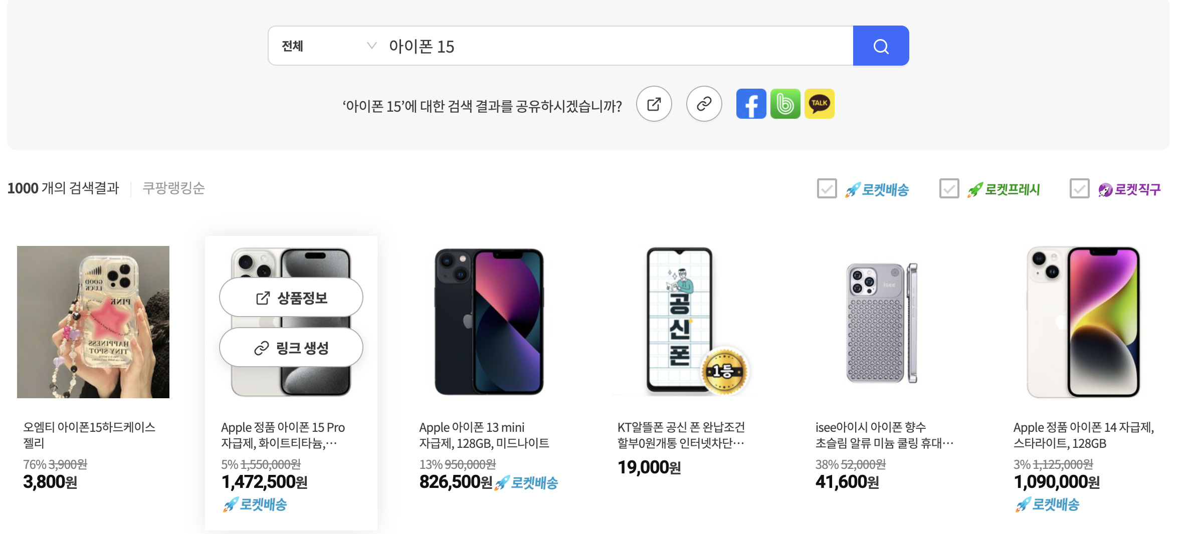 그럼 아래 사진과 같이 아이폰 15에 관련된 제품들이 나열이 되며 팔고 싶은 제품을 클릭을 하면 2가지 상품정보, 링크생성이라는 버튼을 볼수있을겁니다.  링크 생성을 눌러 주고 자신의 블로그에 링크를 삽입하여 글을 발행을 해줍니다.  마지막으로 링크 생성을 할 때 공정위문구가 나오게 되는데 그 부분은 블로그 본문 내용에 꼭 넣어주셔야합니다. 공정위문구를 넣지않으면 열심히 수익을 벌었는 부분을 출금을 하지못하는 경우가 생기니 꼭 확인해야할 것 중 하나입니다.