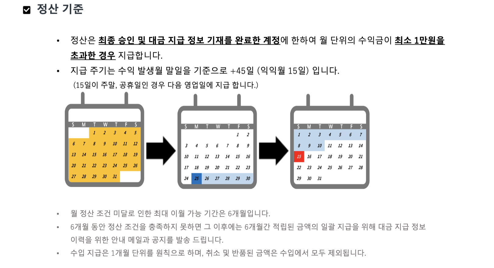 쿠팡파트너스 수익 지급일은 매달 15일에 지급이 되며, 총 수익금은 만원이상이 되어야 지급이 된다.
