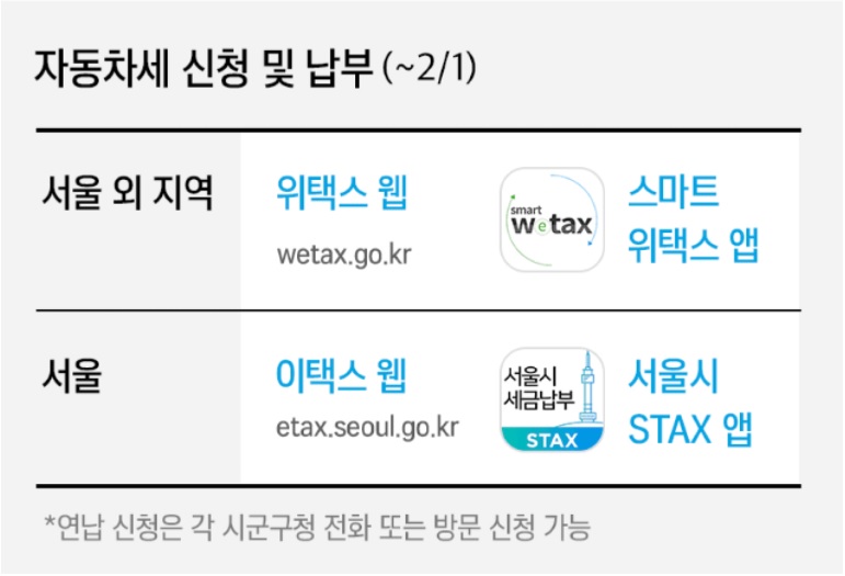• 위택스(www.wetax.go.kr)로 통해 자동차세를 미리 연납한 경우 연내 다른 시, 도로 이사하더라도 새로운 주소지에서 자동차세를 추가로 납부하지않아도 된다.