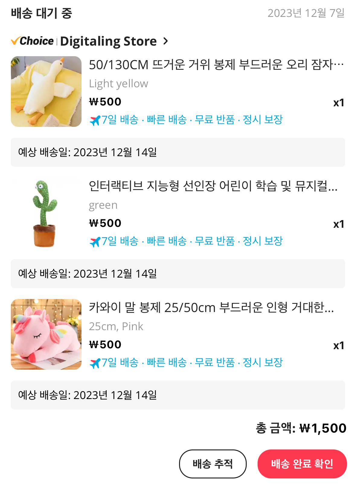 아이들에게 줄 인형들을 3개 구매하였는데 가격은 1500원이였으며, 엄청 가격이 저렴한 것을 알 수 있으며 배송일은 5~7일 정도 소요가 된다고 한다.
