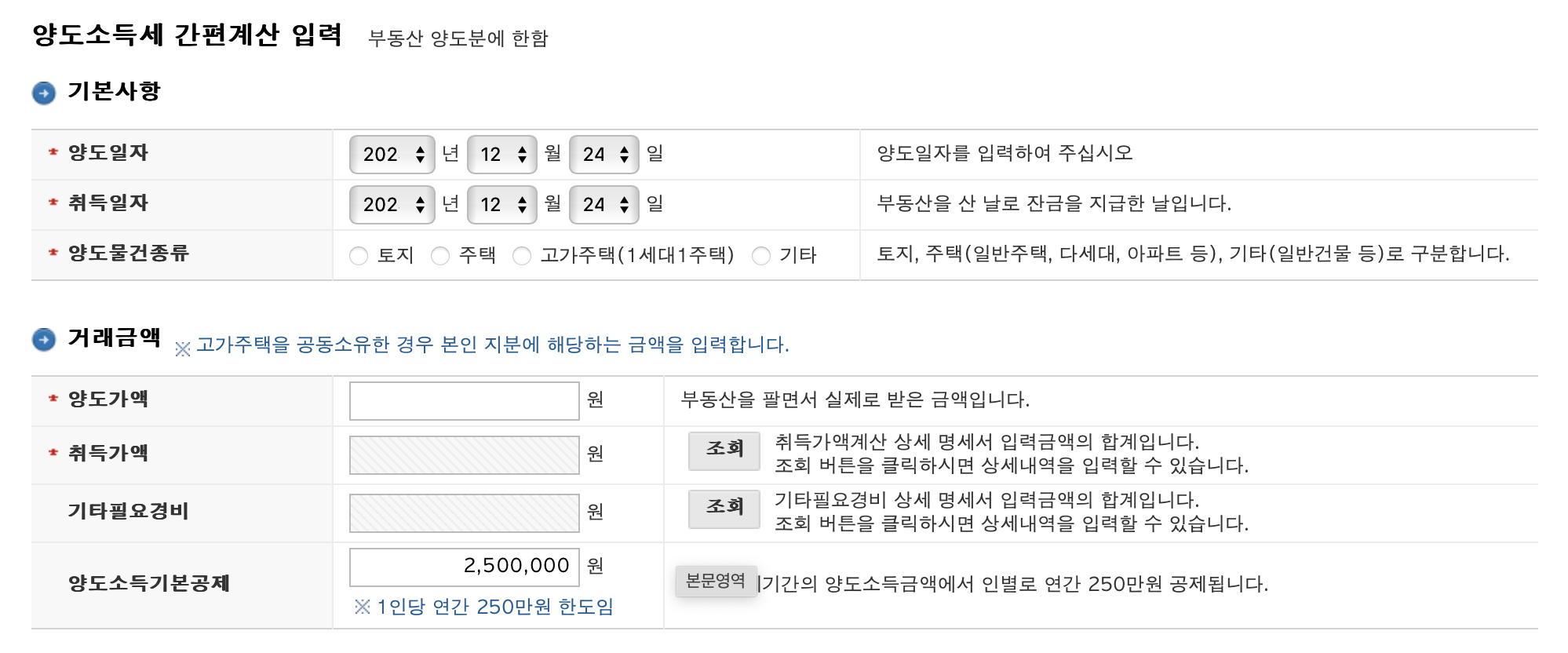 > 양도소득세 간편계산 입력 방법