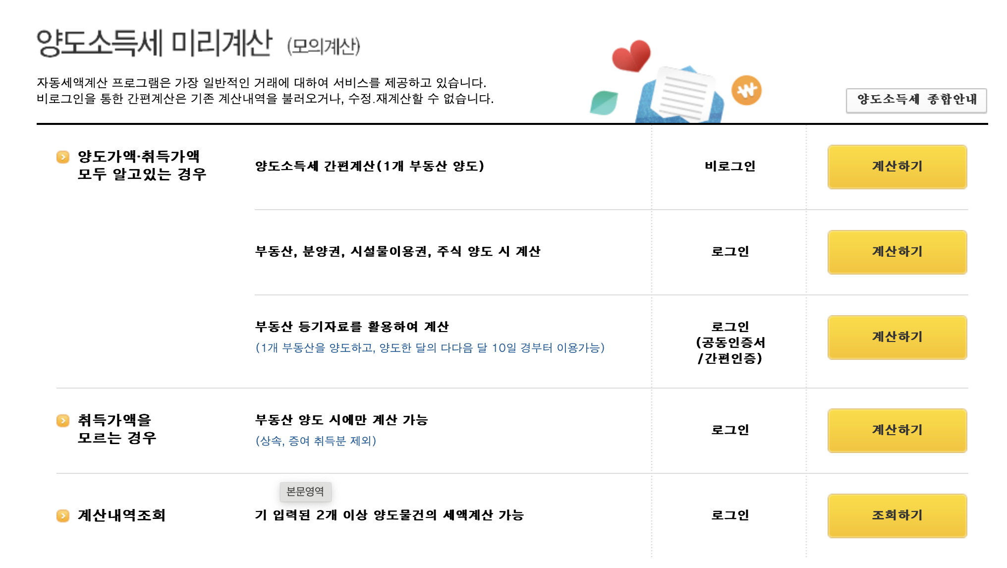 양도소득세 간편계산비로그인으로 계산이 가능하지만 부동산 등기자료로 인한 계산을 해야하는 경우에는 로그인과 공동인증서 / 간편인증이 필요하기때문에 참고해주시기 바랍니다.