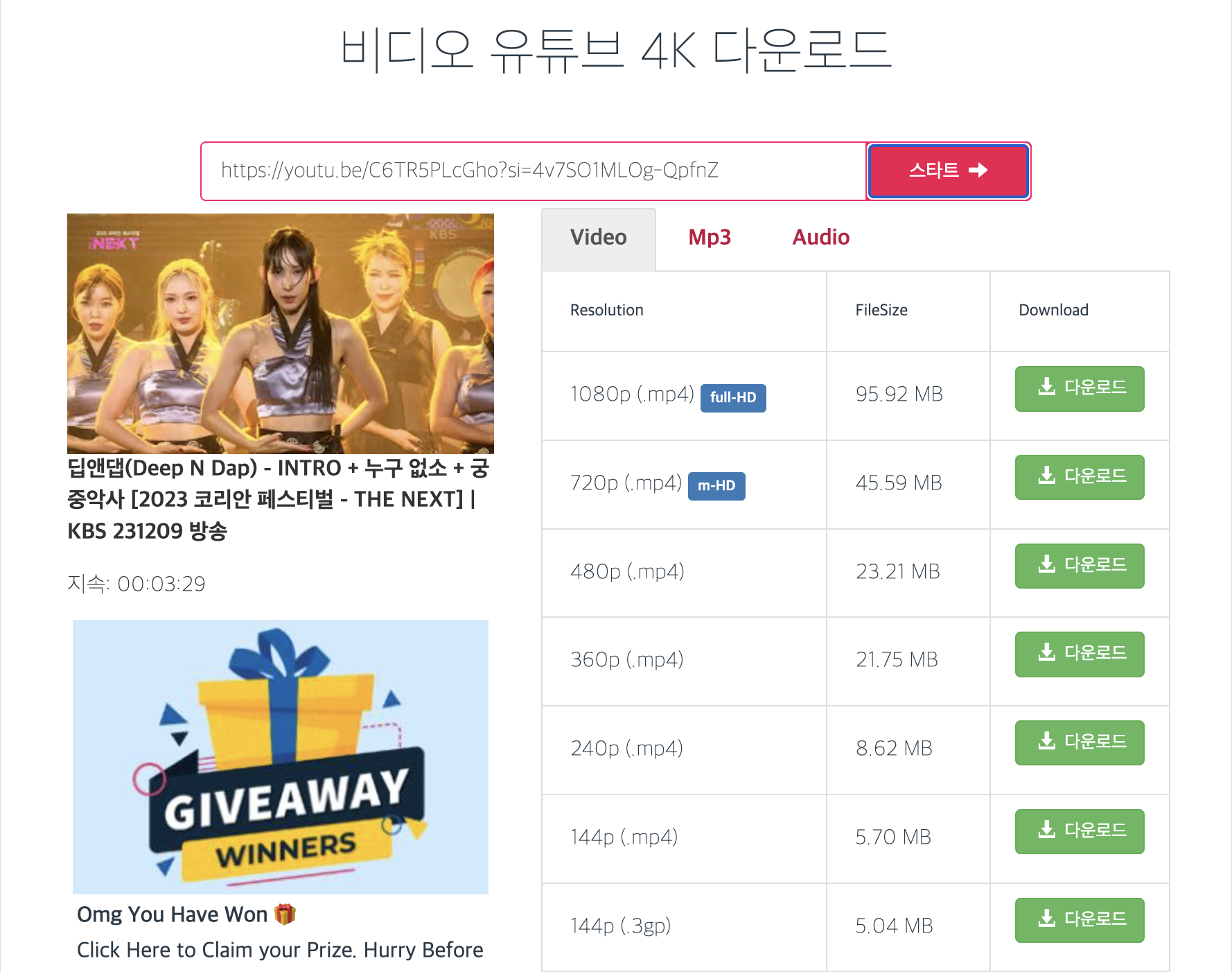 3. 복사한 동영상을 비디오 유튜브 4K 다운로드 검색어에 붙여 넣기를 해주고 스타트를 누르게 되면 아래와 같이 동영상을 다운로드하실 수 있습니다. 파일 용량과 화질에 따라서 다운로드를 할 수 있기 때문에 본인이 원하는 파일을 다운로드하시기 바랍니다.