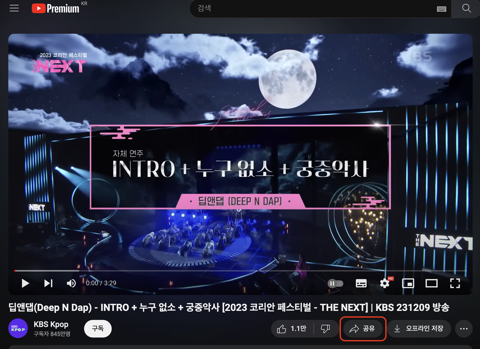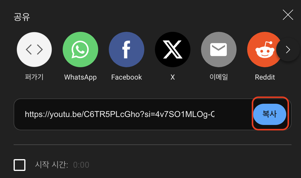 아래 사진을 보면 빨간색 네모칸에 공유를 클릭합니다. ( 모든 유튜브 동영상 동일합니다. )