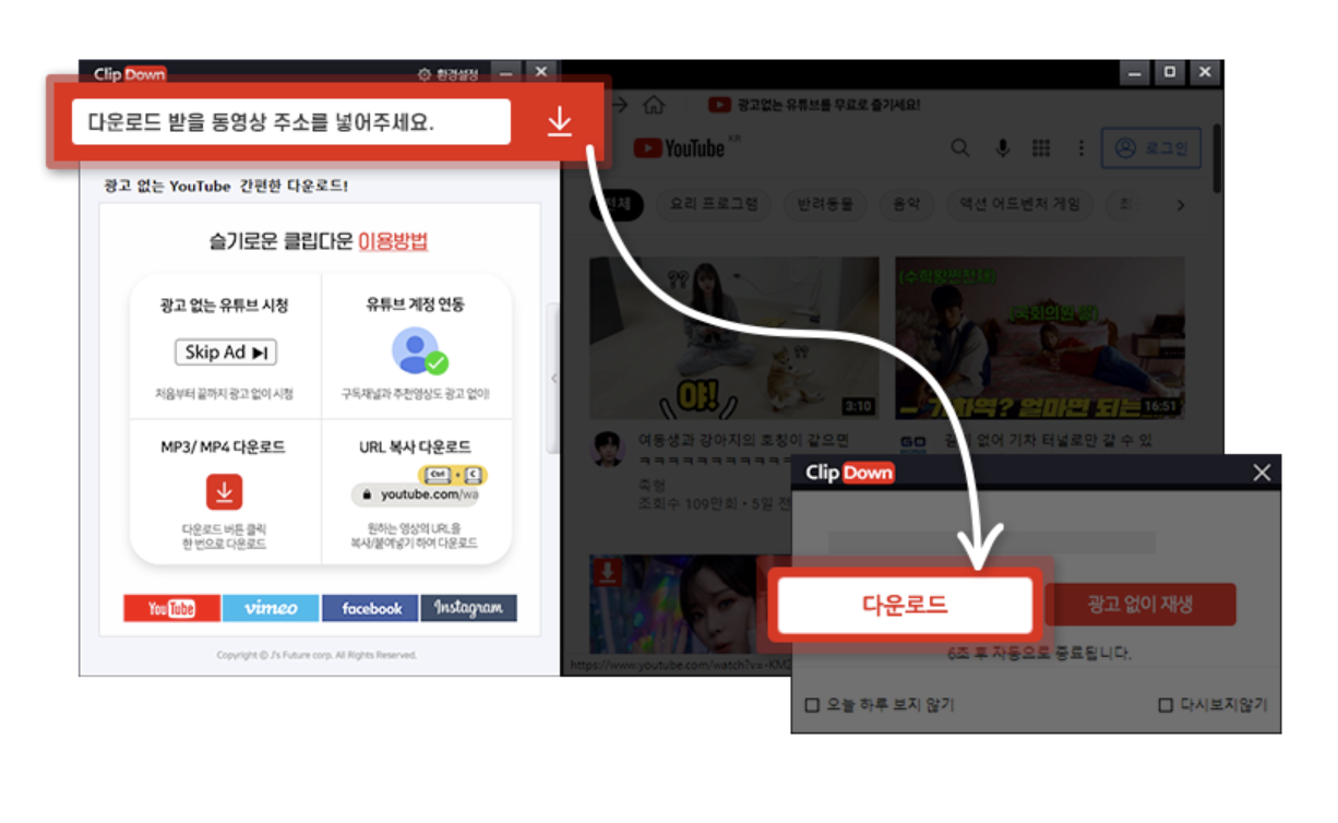 클립다운은 동영상과 음원 추출을 동시에 할 수 있는 프로그램 파일입니다. 유튜브 시청도 가능하며 자세한 사용법은 클립다운 공식홈페이지를 접속하여 확인해 주시기 바랍니다 > 클립다운 공식홈페이지 접속 바로가기