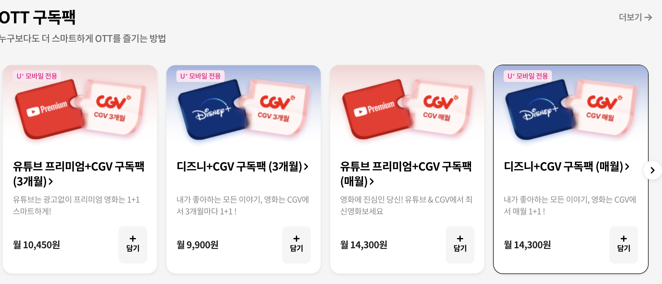 유튜브 프리미엄은 월 14,900원이지만 유독픽으로 유튜브 프리미엄 + CGV 구독팩을 하여도 10,450원이기때문에 4천원을 더욱 아낄수 있다. 뿐만 아니라 디즈니 + CGV 조합도 가능하여 더욱 평소보다 저렴한 금액으로 OTT 서비스를 볼수있다.