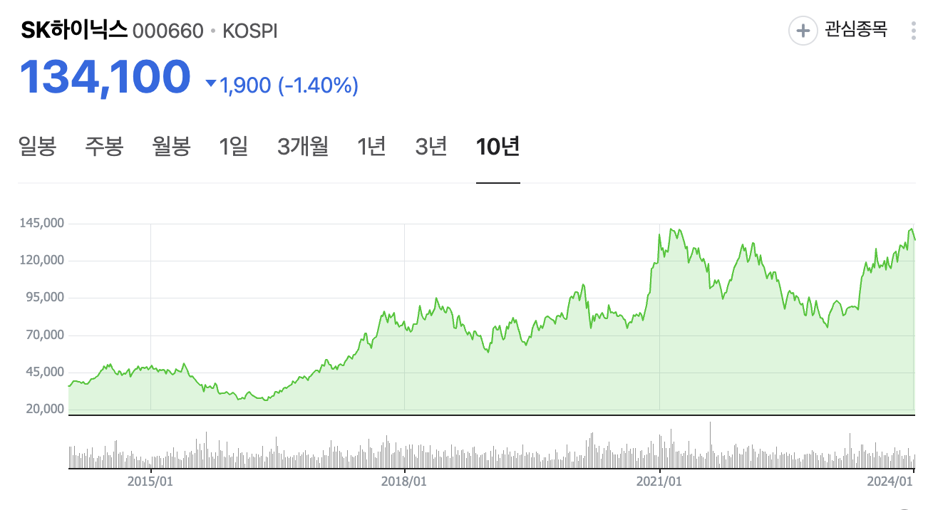 연일 나스닥에서는 엔비디아가 엄청난 상승세로 시장을 주도하고 있지만, 코스피 시장에서는 SK하이닉스가 14만원대에서 현재 주가는 134,100원을 기록하고 있다. 개인은 순매수를 하고 있으며, 기관과 외인들은 매도를 하고 있다. 하지만, 주식은 하루 하루 순매수, 순매도를 보는 것이 아니라 현재의 기업과 미래의 기업 가치를 보며 매수를 하기때문에 하루마다 기관이 매수를 하고 외인이 매도를 하는 부분에서 너무 신경쓰지 않는 것이 좋은 것으로 보인다.