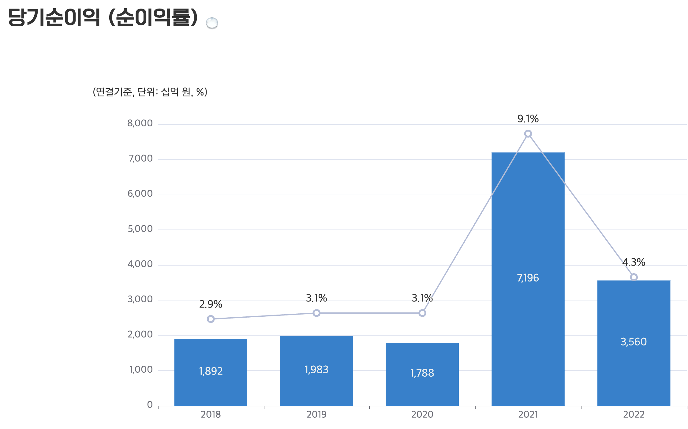 당기순이익또한 영업이익률과 비슷한 양상을 보이고 있으며, 2023년 4분기 실적까지는 나오지않았지만 2022도 전년 대비하여서 줄어들것인지 늘것인지 초점을 두어야 하며, 마지막 4분기 실적까지 확인을 해야한다고 생각한다. 하지만, 실적이 낮을수는 있지만 2024년에는 달러가 약세장이 펼쳐지면 또 다른 관점으로 보아야하기도 하며, 2차전지와 철강 주요 사업을 본다면 배당금도 많이 주며, 장기적으로는 좋은 기업이지않을까 싶다.