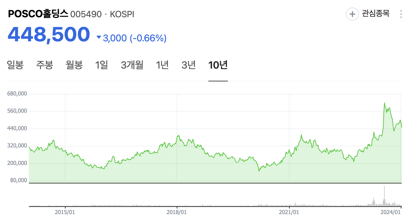 현재는 철강과 2차전지로 인하여 60만원이상 올라갔던 포스코홀딩스 주가는 448,500원이지만 미래를 보고 2차전지 설비와 공장에 투자를 하며 리튬, 철강 사업도 점차 나아질것으로 보이기도 하지만, 현재로써는 주식 가격을 시장에서는 많이 조정을 받고 있는 부분이다.