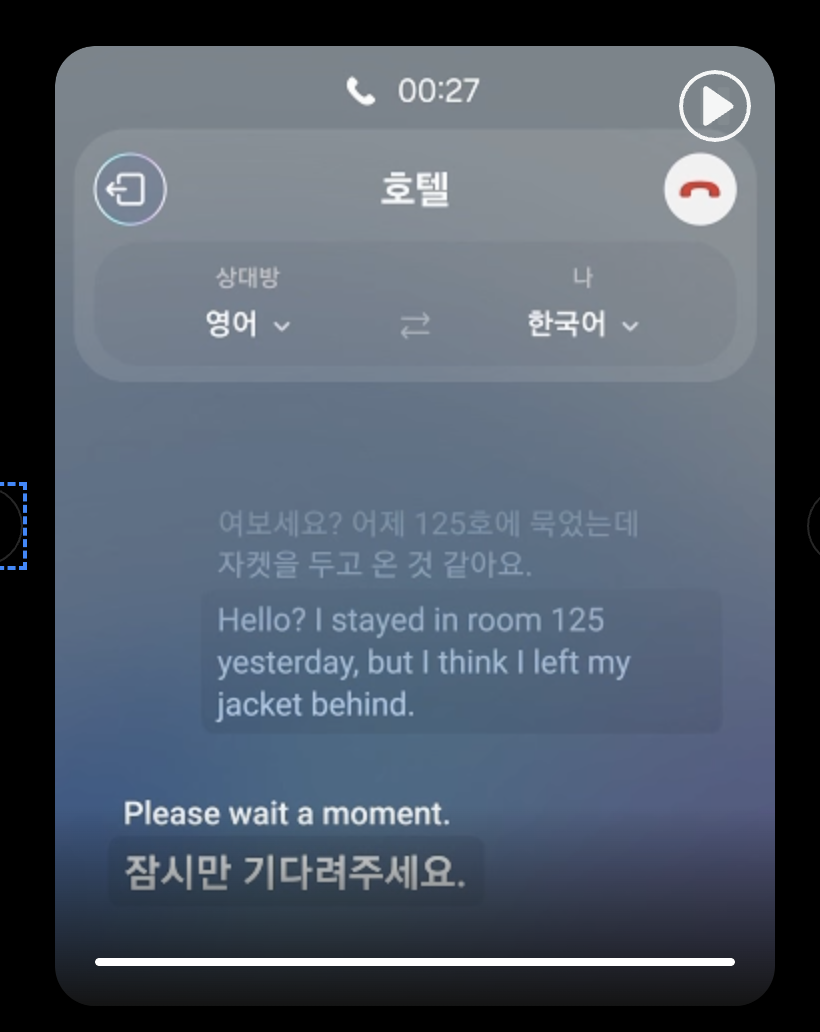 먼저 실시간 통역은 해외여행을 가서 호텔직원에게 전화로 통화를 할때에도 실시간 통역이 자동으로 되어 번역기가 필요없이 자연스럽게 한국어로 이야기를 하면 현지 언어에 맞춰서 실시간 통역이 되어 더욱 편리함을 주고 있습니다.