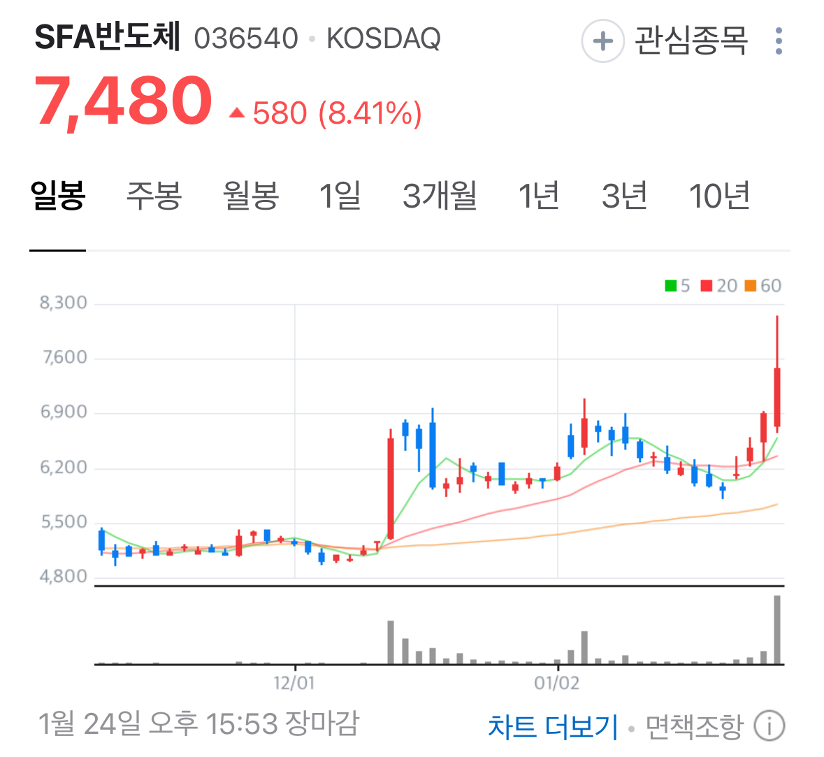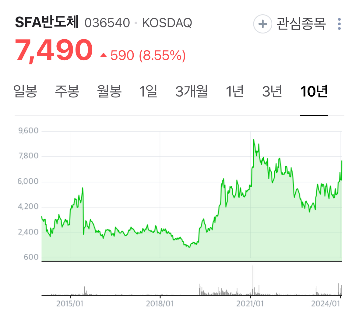 엔비디아가 반도체 주식들을 견인해서 오르는 것도 있지만, 이번 두산테스나에서 패키징 사업진출로 인하여 SFA반도체에 대한 관심을 가지며 그 기대감으로 주식이 오르는 것에 한 몫을 하였다.