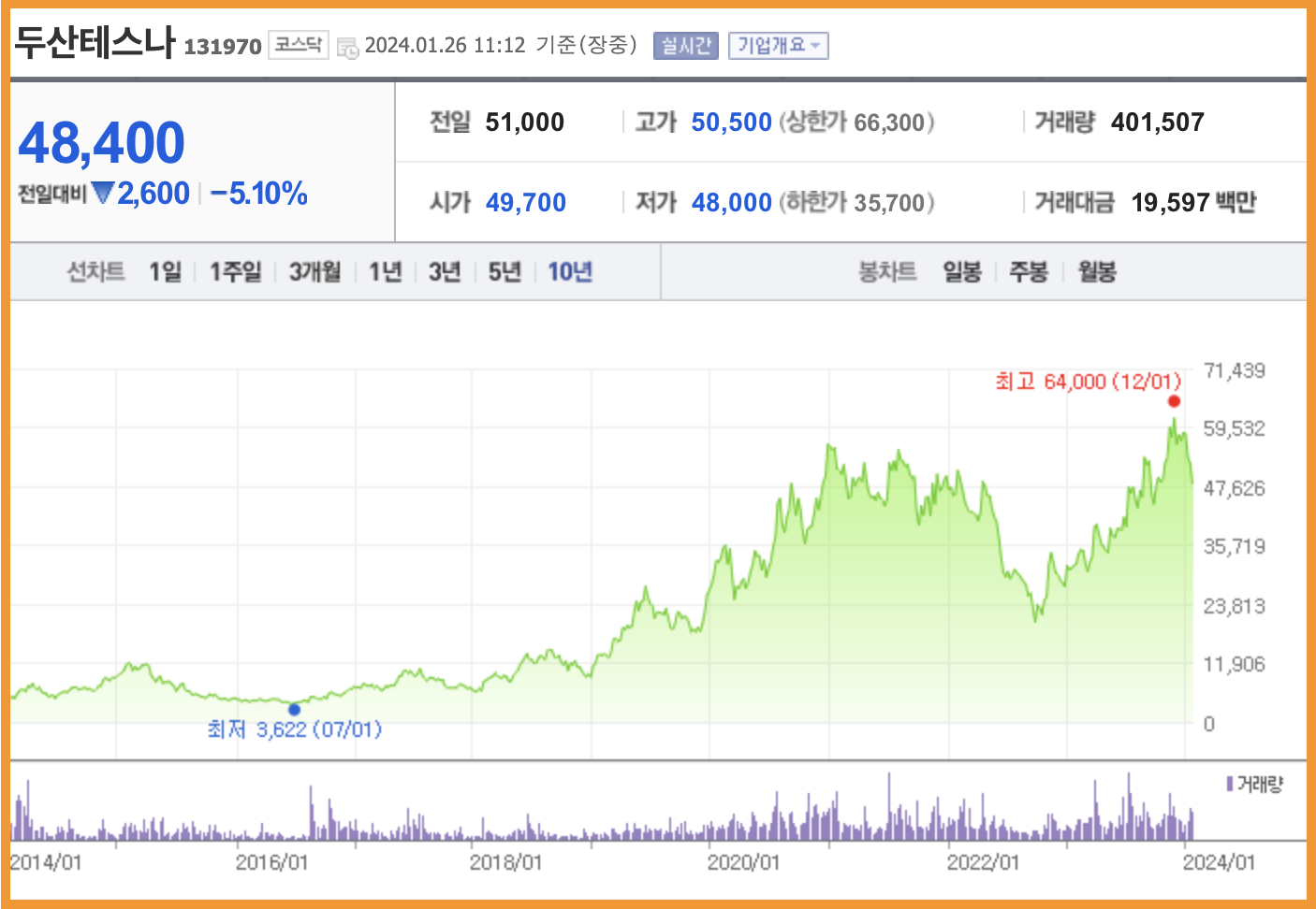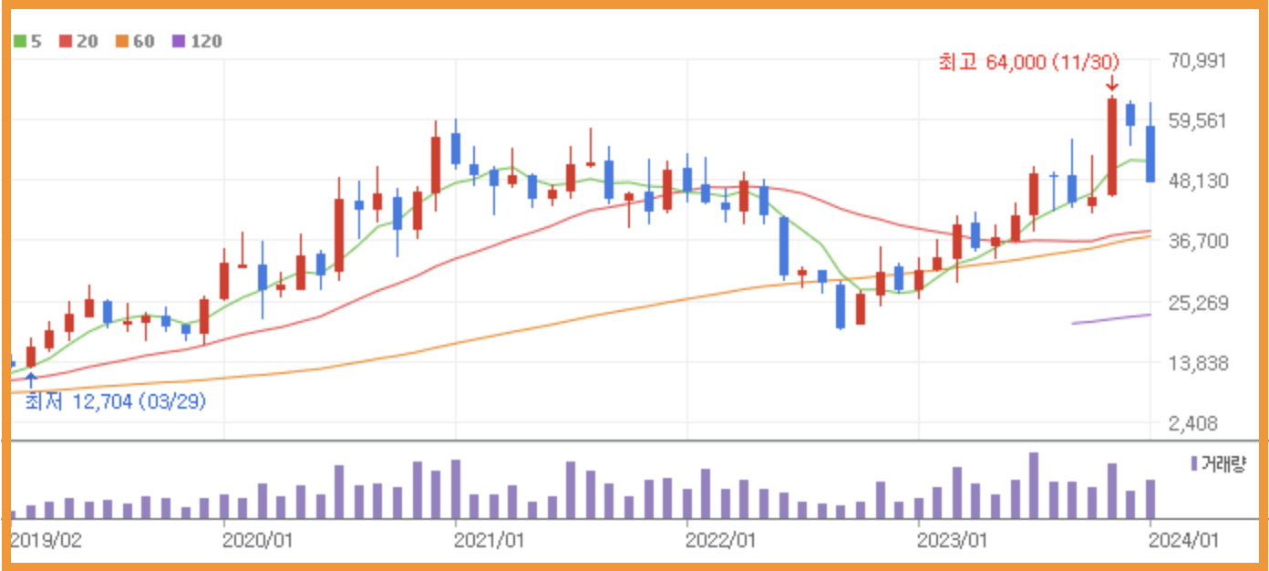 현재 두산테스나 1주는 48,400원대를 기록하고 있습니다. 52주 신고가 64,000원인 것을 감안하면 많이 하락한 상태인데 월봉 그래프로 한번 보겠습니다.