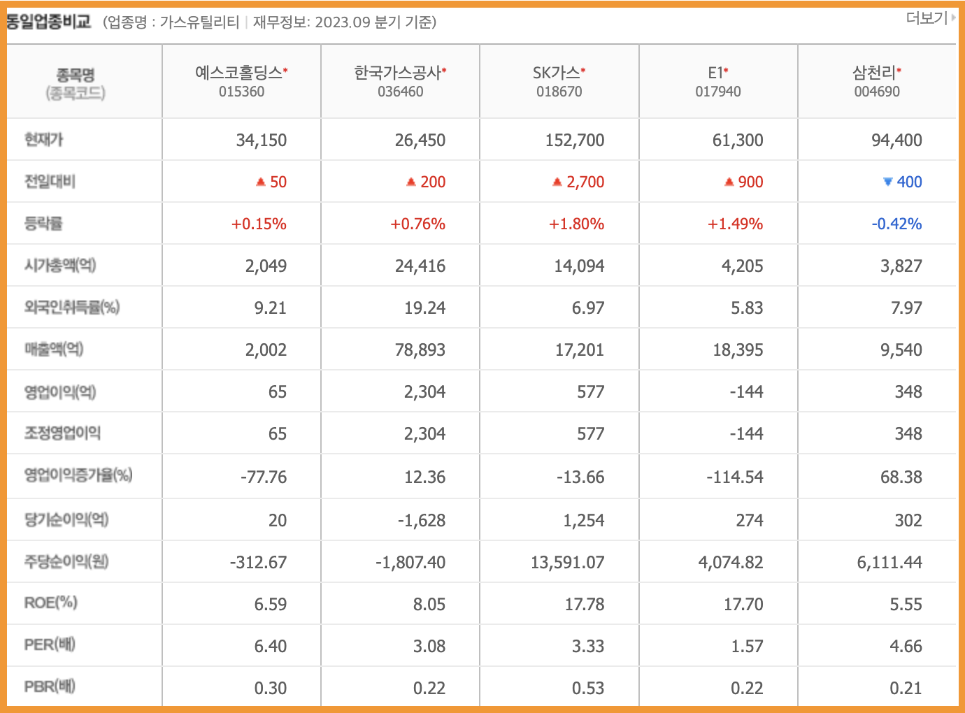 같은 업종으로는 한국가스공사, SK가스, E1, 삼천리가 있으며, 이 중에서는 시가 총액이 가장낮은 기업이며, 매출액 또한 가장 낮다고 볼수있습니다.
