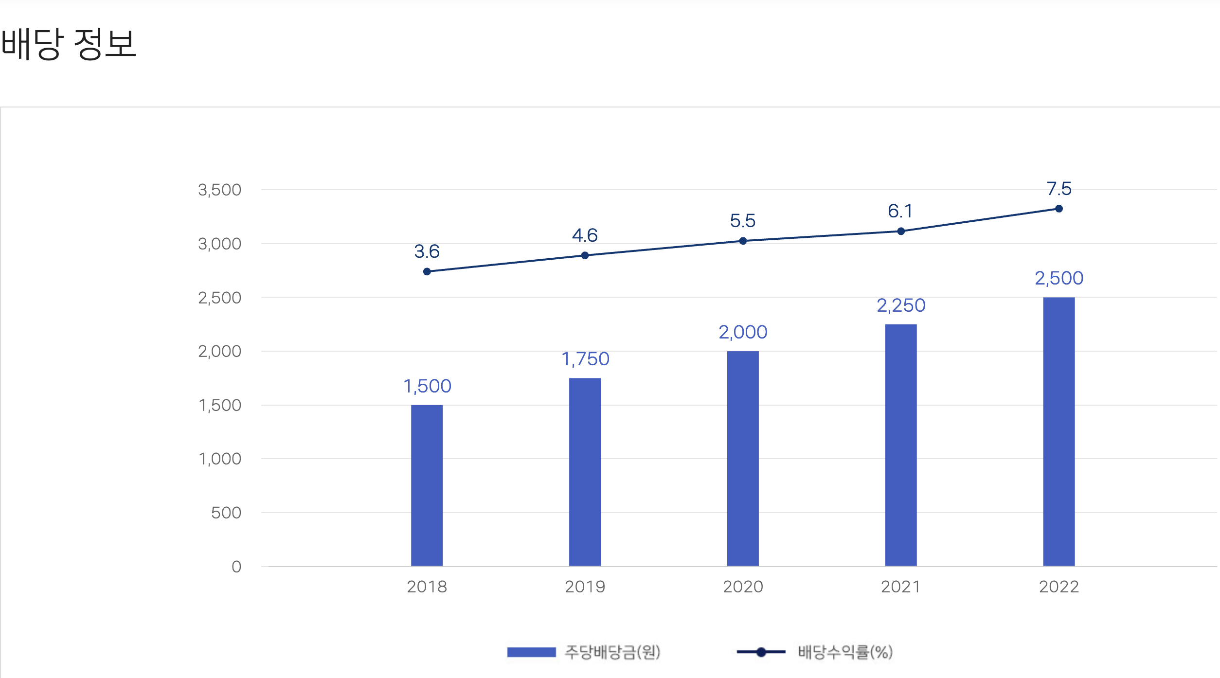 2018년에는 1,500원부터 2022년에는 2,500원까지 꾸준히 배당금도 오르고 있는 상태이며, 배당금이 상승하고 있다는 것은 회사의 사업 영업이익이 오르기 때문에 이 부분에 대해서 주주들에게 환원해주는 것이라고 생각하시면 됩니다.