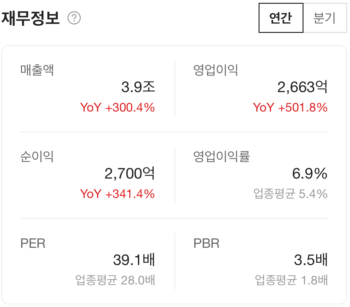 연간실적을 확인해보면 2023년 한 해동안 매출액 + 300%를 달성하였으며, 영업이익은 + 501%, 순이익은 + 341%를 달성하였습니다.