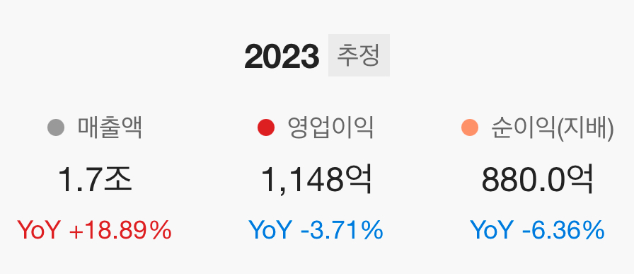 2023년 1분기에는 엉업이익과 순이익 모두 적자기록하였지만 2분기와 3분기는 순이익이 소폭 상승하여 적자에서 흑자전환을 하였고 4분기 추정 실적은 영업이익이 +35% 를 상승할 것으로 추정이 되며, 이를 종합적해보면 위 연간 실적으로 될 것으로 보입니다.