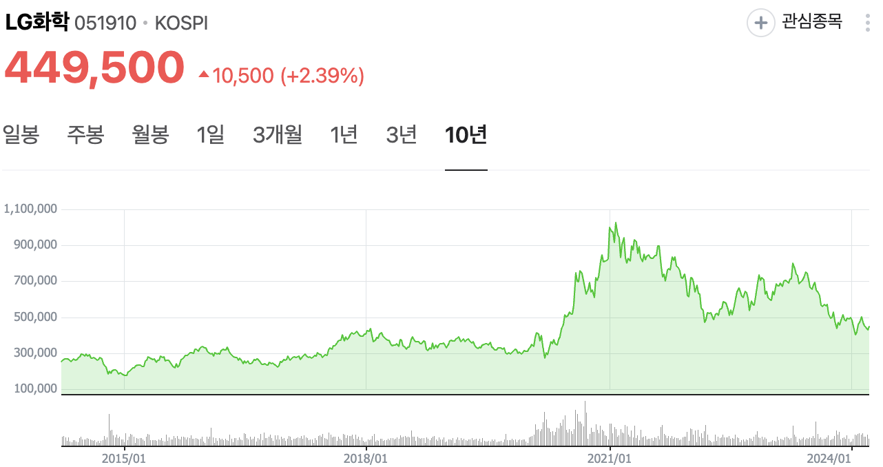먼저 큰 주가 움직임을 보기위해서는 전체적인 주식 차트를 살펴보도록 하겠습니다. 10년 치 차트를 살펴보면 2021년 최고주가인 100만 원을 넘었던 주가는 현재 50%이상 떨어진 449,500원입니다. 과거에는 LG화학이 2차 전지 배터리 사업부가 함께 있었으며, 화학 사업과 배터리사업을 같이하였지만 LG에너지솔루션이 상장이 되고 사업부가 분리가 되면서 주가는 하락을 하면서 현재 주가까지 내려오기 되었습니다.