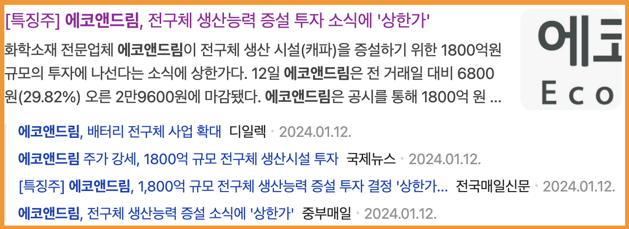 최근 에코앤드림의 주가는 19,000원의 저점에서 단기간에 89,900원까지 상승을 하였습니다. 어떠한 호재로 인하여 상승을 하였는지 알아보도록 하겠습니다. 최근 1월의 뉴스들을 한번 찾아보았습니다. 아래를 확인해 보세요.