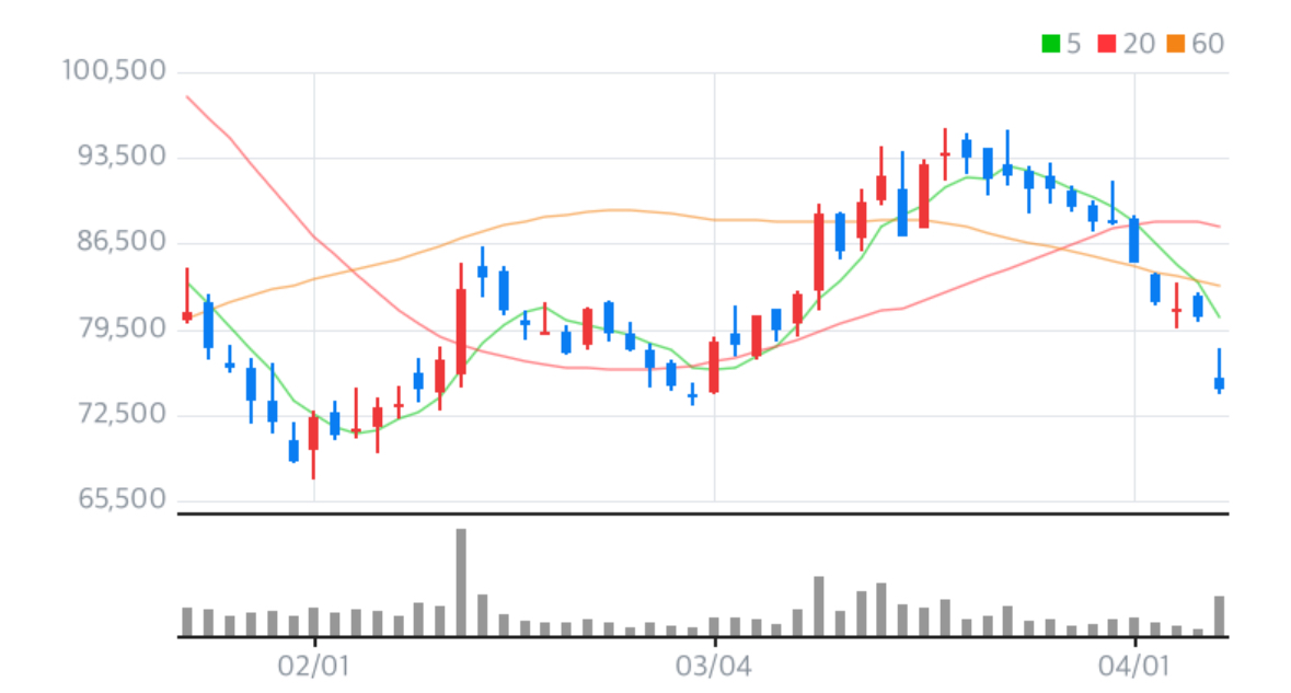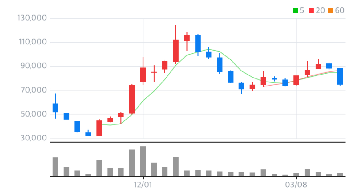 오른 날보다 하락한 날이 훨씬많으며 현재는 차트로 보았을 때 데드크로스 초입으로 보이며 현재 강한 주가 하락세가 보이기에 투자하기에 좋지않습니다. 현재 반등하지 못하고 하락세가 이어진다면 단기로는 7만 원이 깨지고 주가 앞자리가 변할 수도 있기 때문에 현재의 주가전망은 좋지 않습니다.