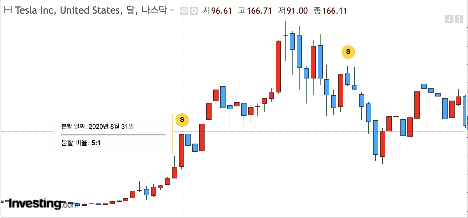 에코프로는 현재 517,000원에 주식 액면 분할 후 1주당 103,400원으로 거래가 될 것으로 보이며, 이전 테슬라도 2020년 8월에 액면 분할을 하게 되며 주가가 상승하게 되었습니다. 이후 단기간으로는 주식이 횡보를 하였지만, 액면 분할이 된 3개월 이후에는 주가가 오르기도 하였습니다. 주식 분할하였을 당시인 차트를 한번 알아보도록 하겠습니다.