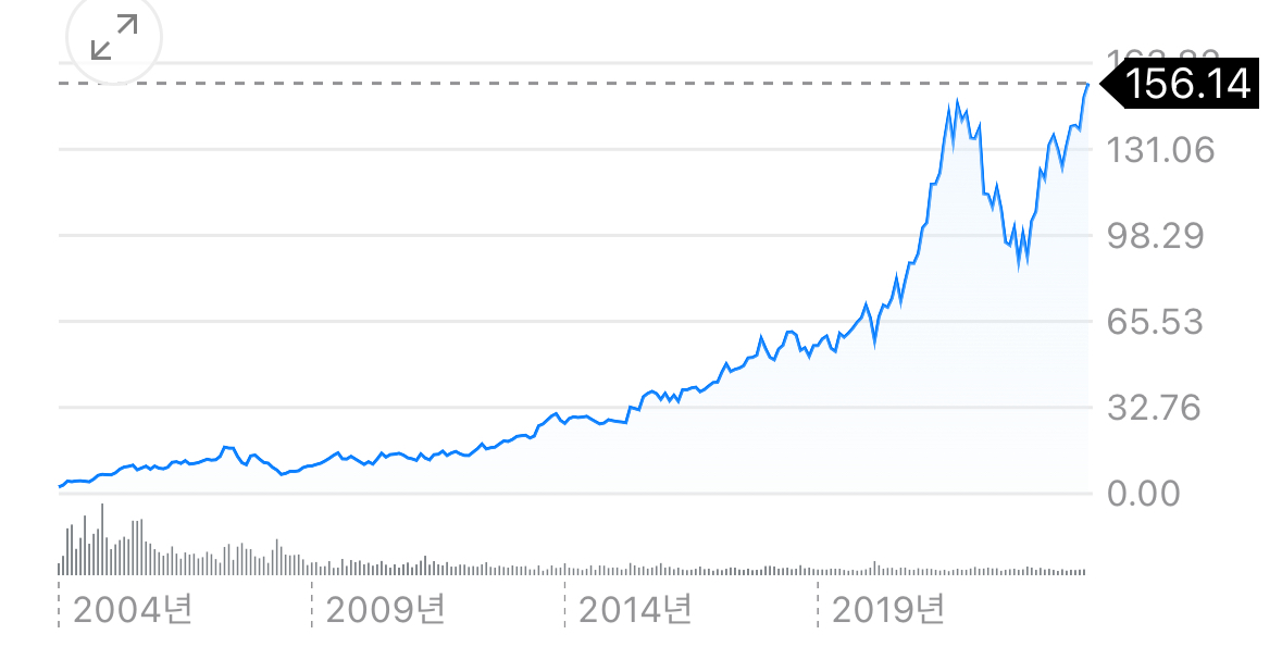 : 구글은 글로벌 기업이며 인터넷 포털서비스, 웹, 동영상 등 서비스를 제공하는 기업입니다. 시가총액은 1조 558억 달러이며 한화로 2000조가 넘는 시총을 가진 글로벌 검색엔진 1위 기업입니다. 처음에 상장된 것은 2004년 8월 19일에 상장이 되었으며, 이후 장기적인 우상향을 하게 되어 현재 주가인 156.14달러(원화-21만 2800원)가 나스닥 시장에서 거래가 되고 있습니다.