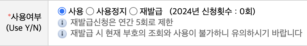 • 위와 같이 사용여부 재발급을 클릭해 주고 발급을 받으면 재발급이 완료됩니다.