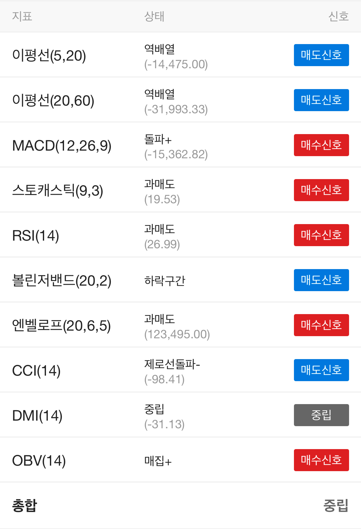현재 매도신호를 나타내는 기술적인 부분이동평균선, 볼린저밴드, CCI가 매도 신호를 보내고 있으며, 매수신호로MACD, 스토캐스틱 과매도로 인한 매수신호, RSI, 엔벨로프, OBV  기술적인 부분에서는 매수신호를 보내고 있는 것을 알 수 있습니다.