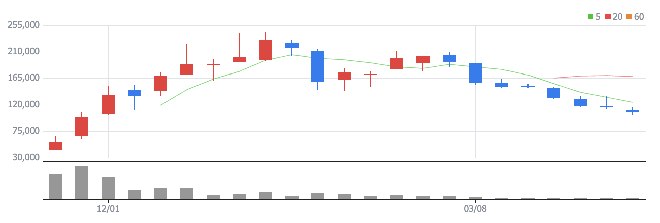 주봉차트를 보아도 현재 역배열로 5일선 아래에 주가가 있어서 좋지 않은 모습을 보이고 있으며, 일봉 차트처럼 지금 자리에서 주가가 오르지 못한다면 조금 더 하락할 것으로 예상이 되기도 합니다. 공모주 주가에 비해서 52주 신고가까지 많은 주가까지 오르고 내리고 있기 때문에 더욱 안 좋은 상황이지만, 언제 반등을 하여 이동평균선이 다시 정배열로 바뀔지는 많은 관심을 가져가며 관심종목을 저장해 준 뒤 꾸준히 확인을 해야 할 것으로 보입니다.