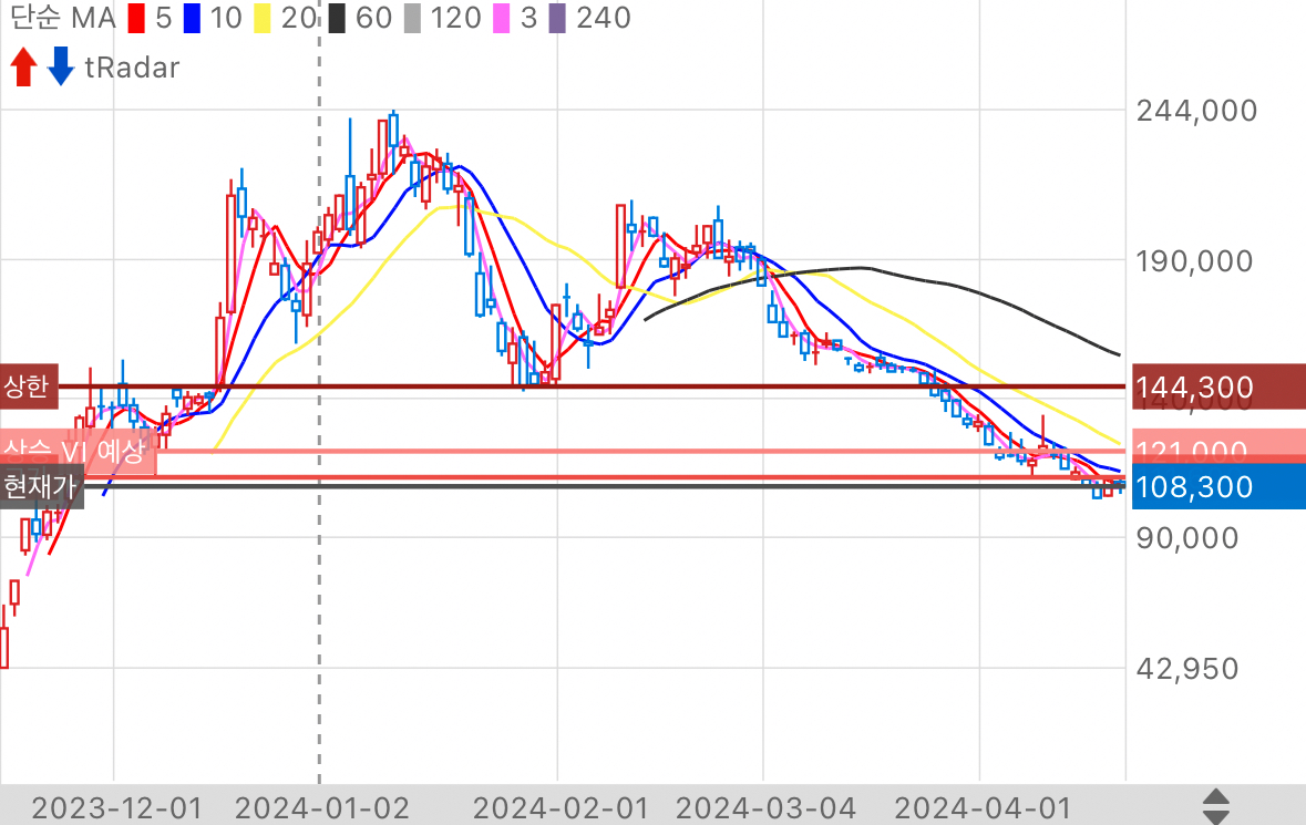 현재 주가인 108,300원에서 상승을 한다면 목표주가는 135,000원으로 볼 수 있습니다. 135,000원이라는 목표주가를 넘어서고 강하게 반등을 한다면 다시 이후 14만 원 이상 주가를 바라볼 수 있지만, 현재 글로벌 이슈들을 확인하면 목표주가까지 상승하는 길이 험난할 것으로도 보입니다. 현재 2분기까지는 적자전환이 이어질 수 있으며, 3분기부터는 실적이 좋아질 수도 있기 때문에 목표주가를 신경 쓰는 것이 아니라 현재는 대응에 영역에서 유동적으로 주식투자를 하며 살펴보아야 할 것으로 보입니다.