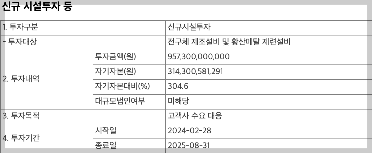 하지만 최근 공시를 보면 신규 시설투자를 발표하였으며, 투자 대상은 전구체 제조설비 및 황산메탈 제련설비를 위한 투자를 한다고 밝혔으며,9573억 원을 투자하며 자기 자본 대비 304% 많은 규모를 투자하며 투자기간은 1년 6개월인 2024년 2월 28일부터 2025년 8월 31일까지로 보입니다.