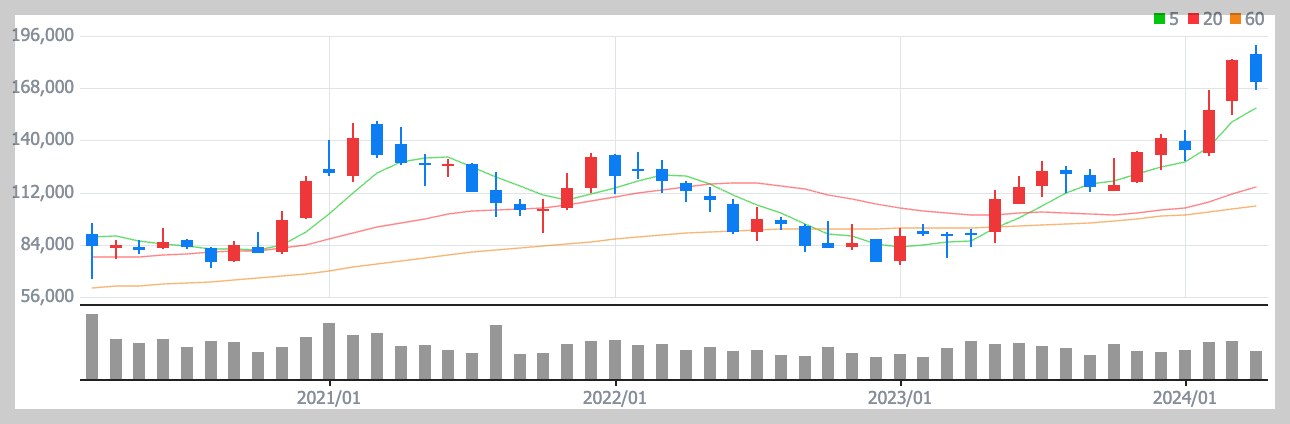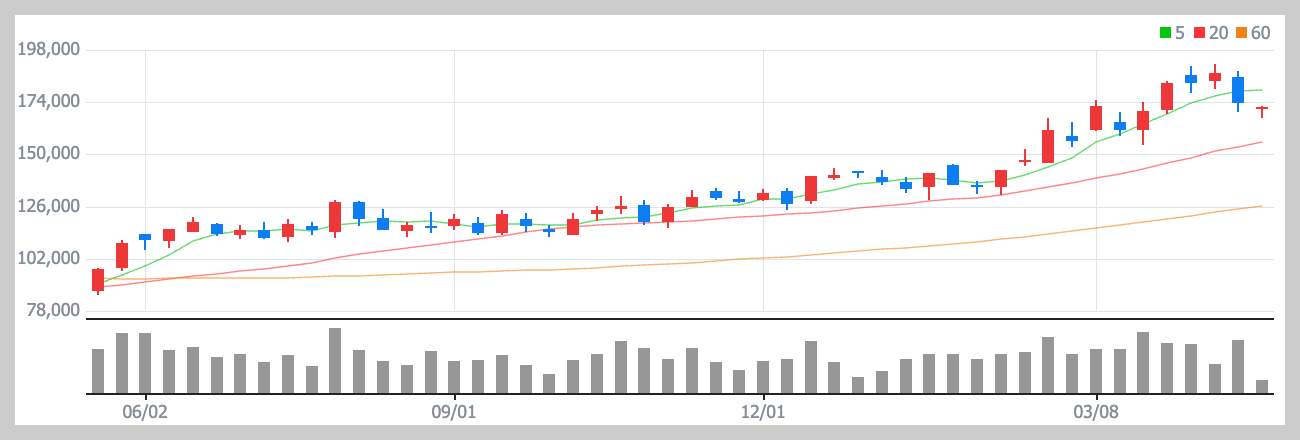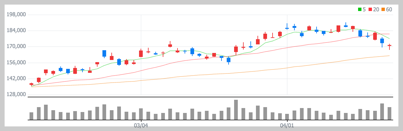 월봉차트에서는 52주 신고가인 191,400원에서 하락을 하고 있는 상태이며, 현재 월봉에서 안 좋은 부분은 이동평균선인 20일선과 현재 주가 위치의 이격이 너무 벌어져 있는 부분이 기술적 관점으로 보았을 때에는 많이 좋지 않은 부분이라고 생각하며 이격이 벌어져있을수록 하락하는 폭이 커질 수도 있기 때문에 조심해야 하는 부분이기도 합니다.