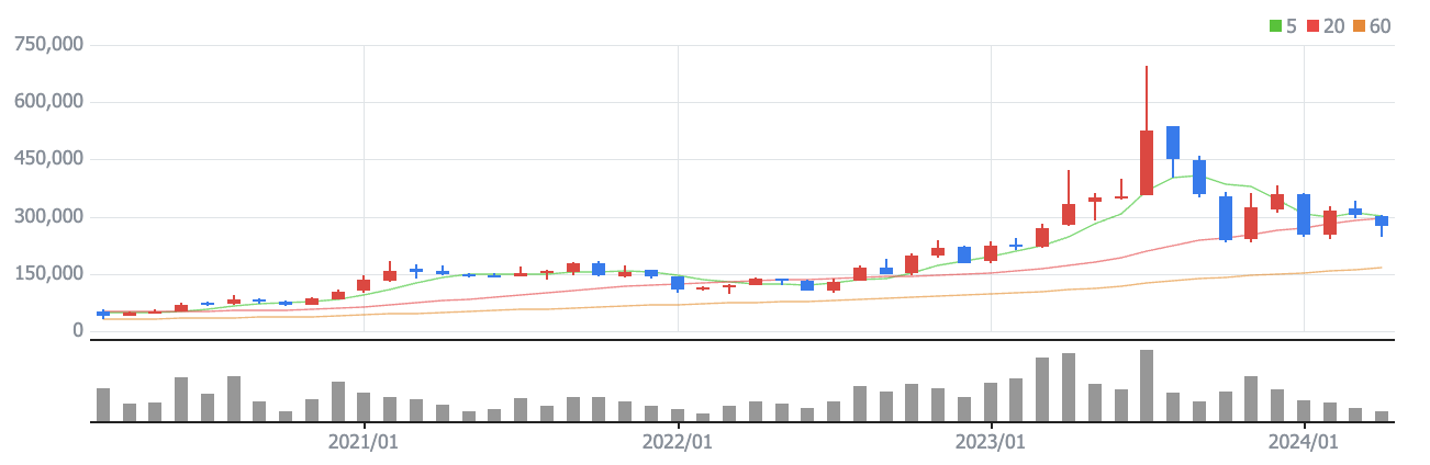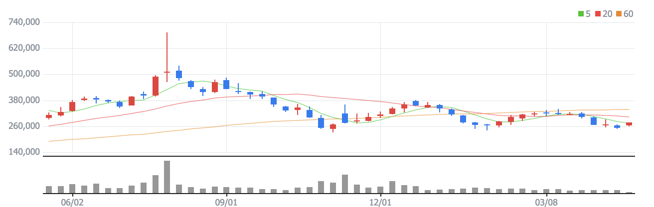: 현재 포스코퓨처엠은 한때 52주 최고가인 694,000원까지 주가가 상승하기도 하였지만, 2023년 11월 1일에는 52주 최저가인 231,500원까지 하락을 하며 저조한 주식 가격으로 개인투자자들을 힘들게 하였지만, 4월 22일에는 시가 263,000원으로 시작해 +9.27% 상승한 277,000원으로 마감을 하였습니다.