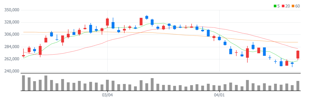 현재 일봉차트를 보면 좋지 않은 모습을 그동안 많이 보였지만, 주가 328,000원에서 262,000원까지 하락을 하며 저점을 낮춰가며 좋지않은 모습이지만 1분기 깜짝실적으로 인한 부분으로 급등을 하며 현재 다시 추세를 돌릴려고 하는 모습을 보여주고 있습니다. 하지만 여전히 이동평균선이 역배열을 이루고 있기때문에 좋지않은 상태지만, 지금 자리에서는 주가가 30만 원 이상 강하게 올려주어야 확실하게 추세를 돌릴 수 있을 것이라 생각을 합니다.