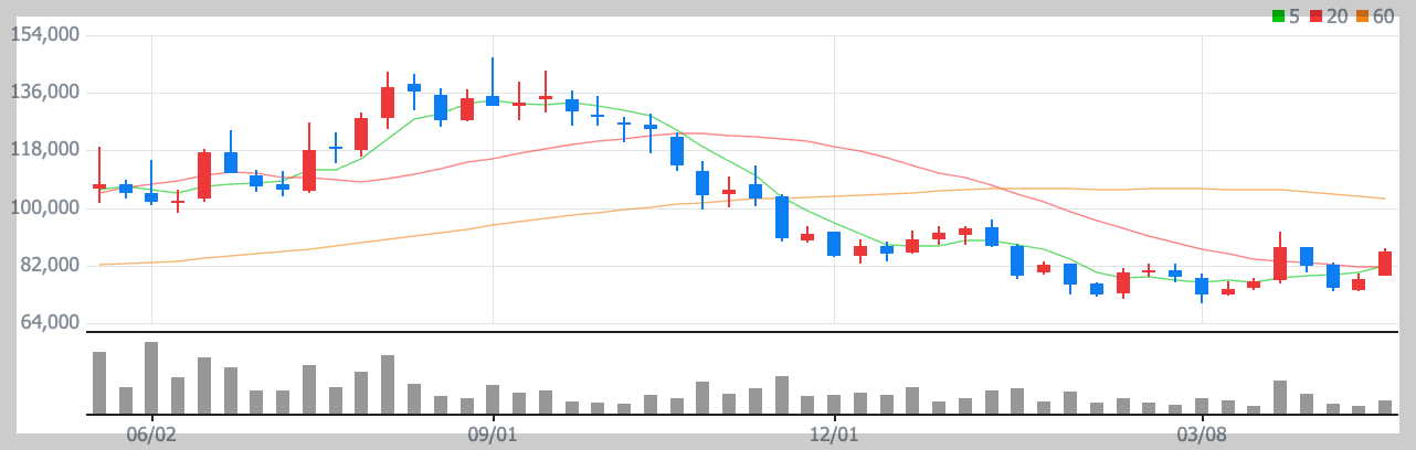 주봉차트를 보아도 현재 바닥을 다지며 큰 리스크가 없어지면 더욱 상승을 할수있을 것이라고 생각합니다. 주식가격이 이동평균선인 60일선보다 아래에 있기 때문에 조심해야 하는 부분이며, 이 부분만 장대양봉으로 상승한다면 추세가 바뀔수도 있기 때문에 기다려봐야 할 것으로도 보입니다.