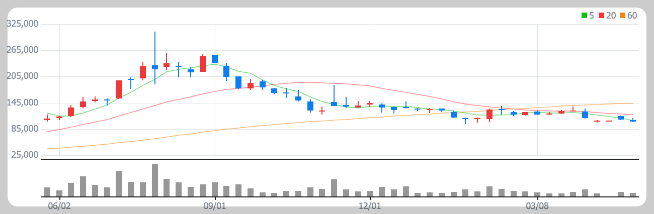 액면분할을 하기전 에코프로의 주가는 1주당 517,000원이었습니다. 5:1 비율로 액면분할을 하였기 때문에 1주당 103,400원으로 거래가 재개되며 현재는 액면분할하고 난 뒤 시가보다 낮은 1주당 101,300원까지 하락한 상태입니다.