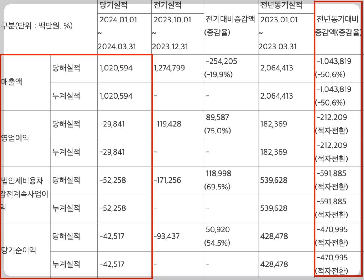 전자공시 다트에서 발표한 에코프로의 1분기 실적이며 매출액, 영업이익, 당기순이익까지 모두 적자전환을 하였는 것을 알수있습니다. 하지만 2차 배터리 종목들은 대부분 1분기에 실적이 좋지 않았으며 2분기부터 상승하는 경우가 많지만, 현재 악재가 더욱 겹쳐서 에코프로 주가에는 좋지 않은 영향을 보여주는 것을 알 수 있습니다.