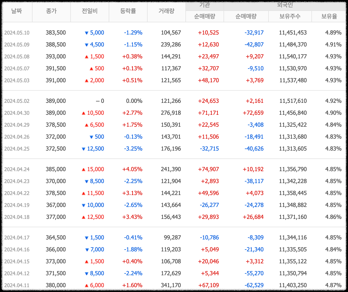 • 외국인보유주식수 : 11,484,370주 (지분율 4.91%)