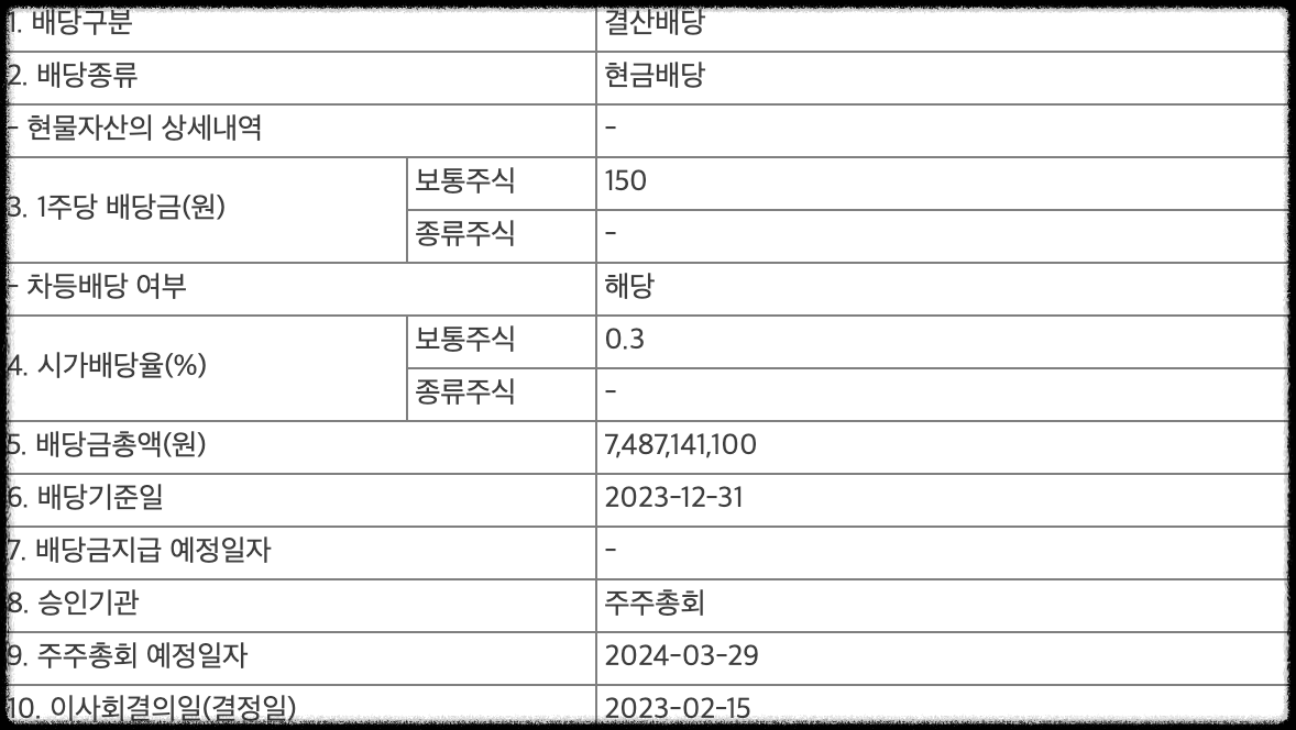 HPSP의 배당금은 2024년 2월 15일에 배당금 공시를 발표를 하였습니다. 1주당 배당금은 150원이며, 시가배당률은 0.3%으로 발표를 하였으며, 배당금을 받으려면 2023년 12월 31일까지 매수를 해야 주주총회 예정일자인 2024년 3월 29일인 1달 이내에 매수한 증권 계좌로 현금입금이 되어 주주들에게 환원을 해주고 있습니다.