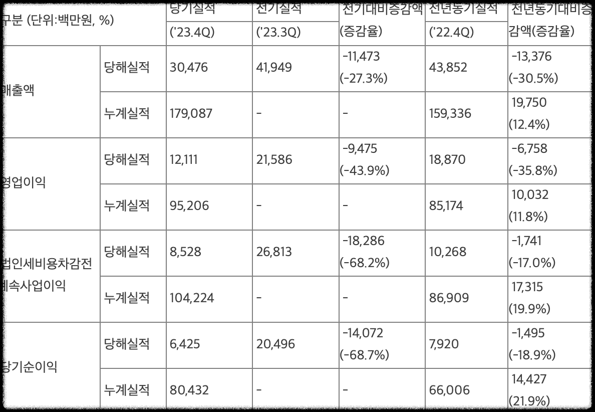 2023년 3분기까지는 매출과 영업이익, 순이익이 좋았지만 4분기 실적은 좋지 않은 모습을 보여주었습니다.